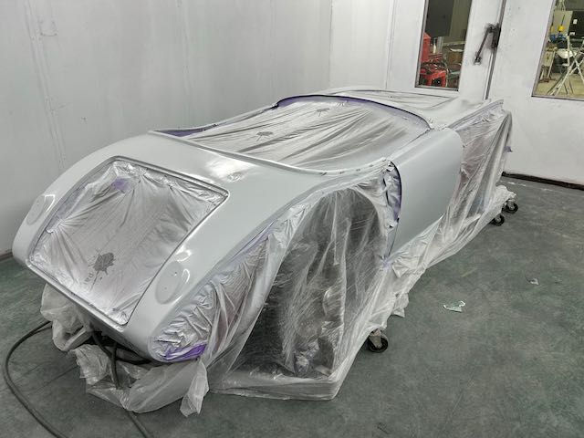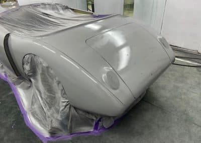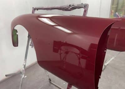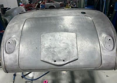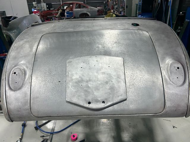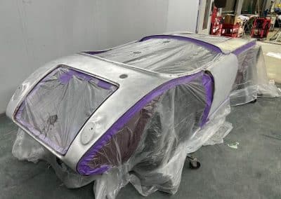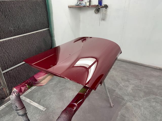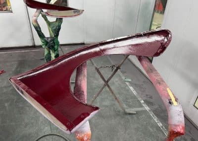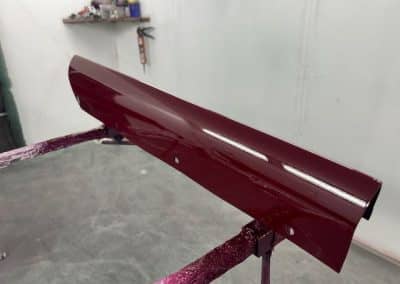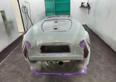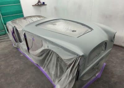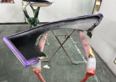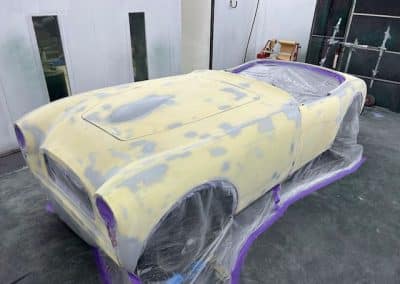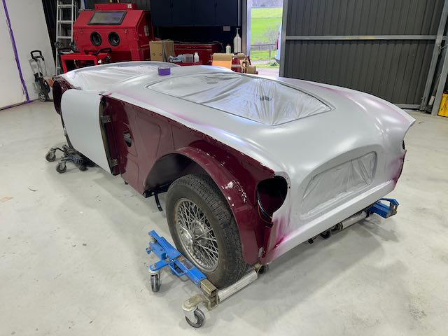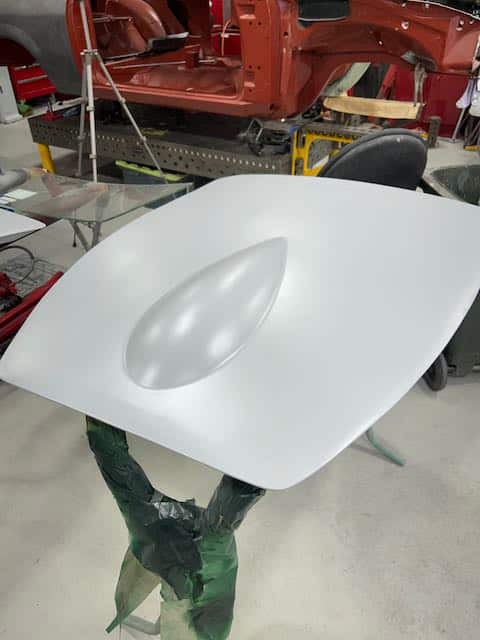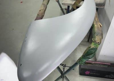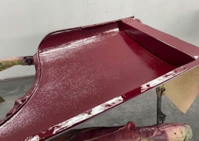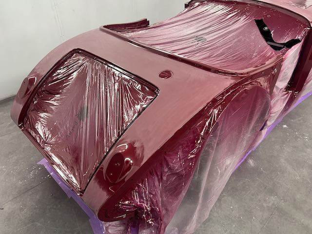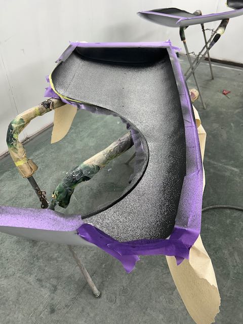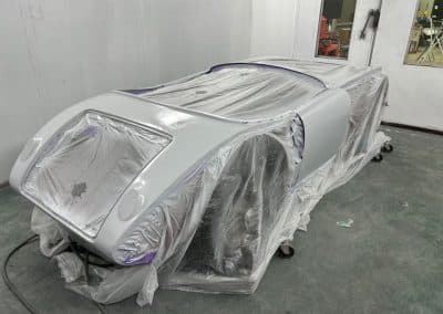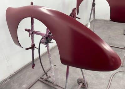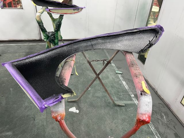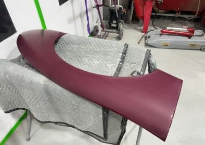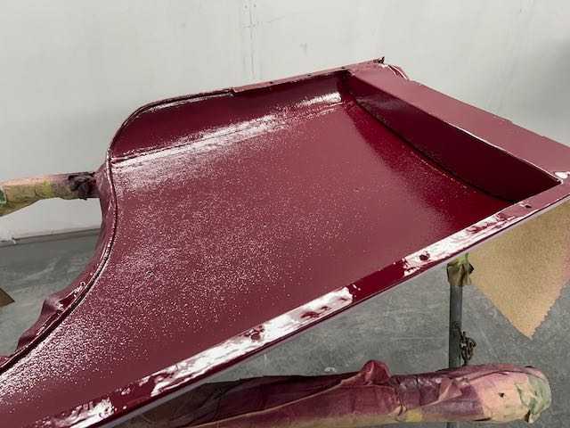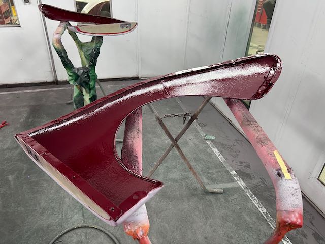 The rear shroud has been prepped and painted in colour on the underside. Then the remade front body structure was media blasted, primed, bodyworked, seam sealed, stoneguarded and painted in colour.