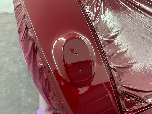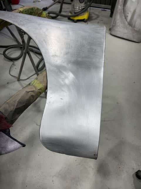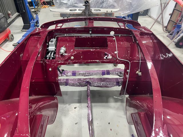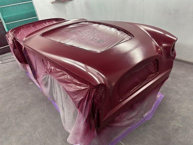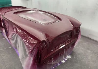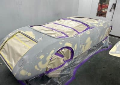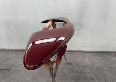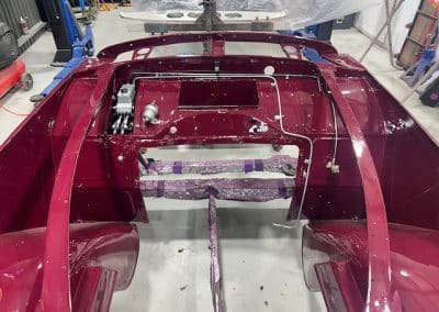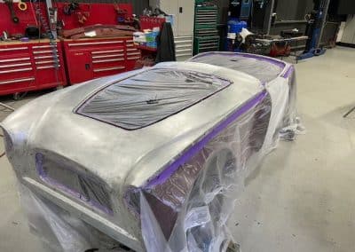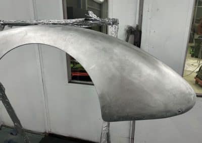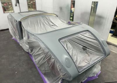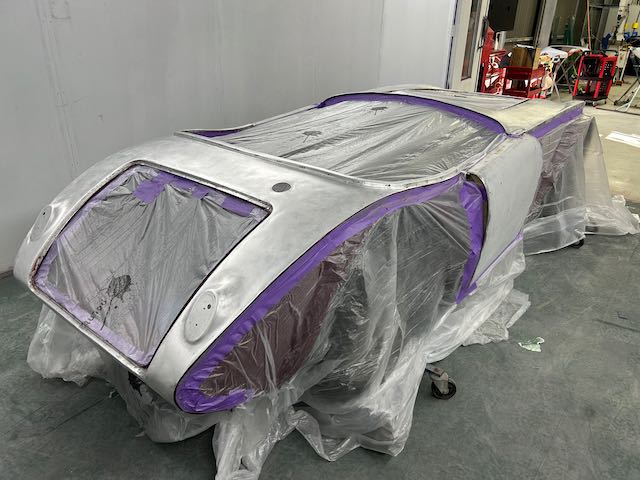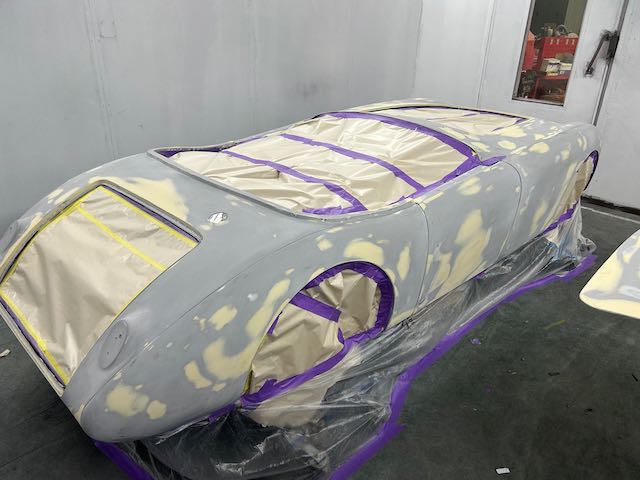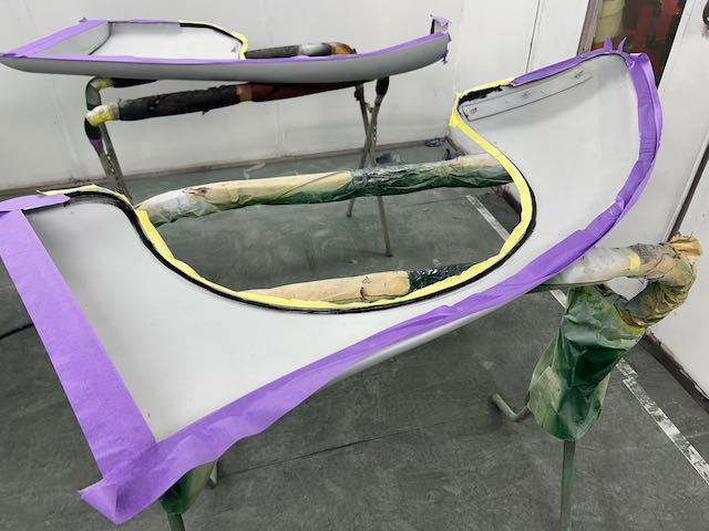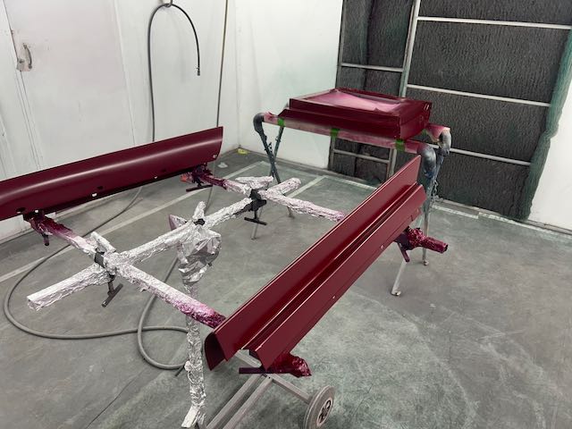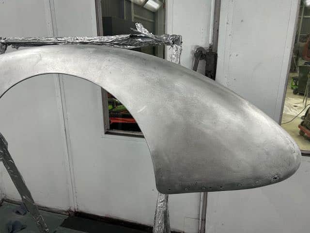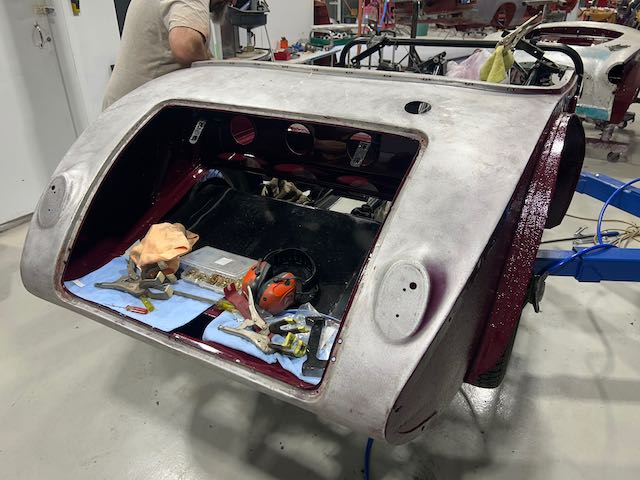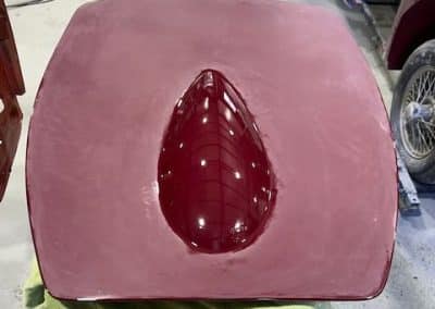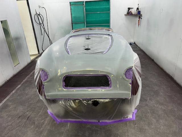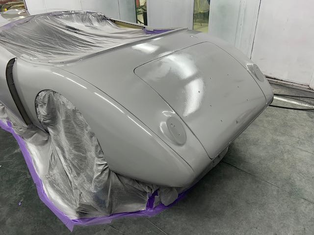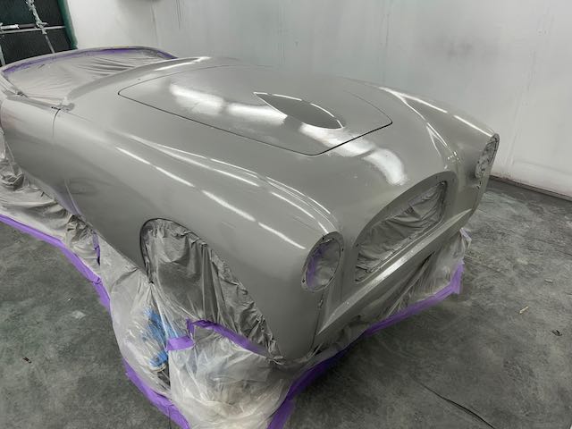 The rear shroud has been prepped and painted in colour on the underside. Then the remade front body structure was media blasted, primed, bodyworked, seam sealed, stoneguarded and painted in colour.