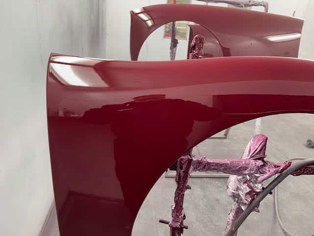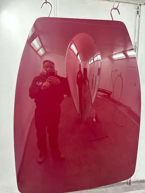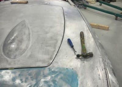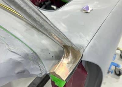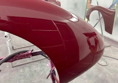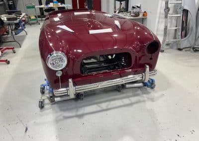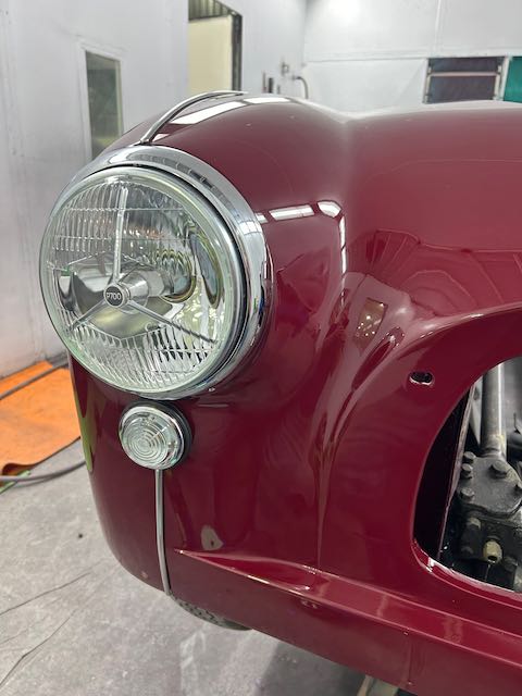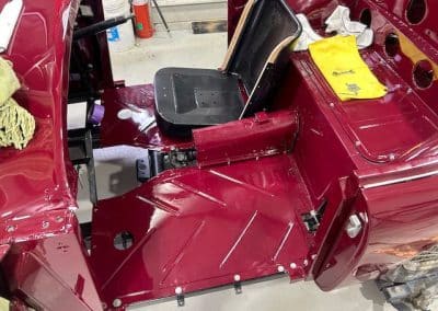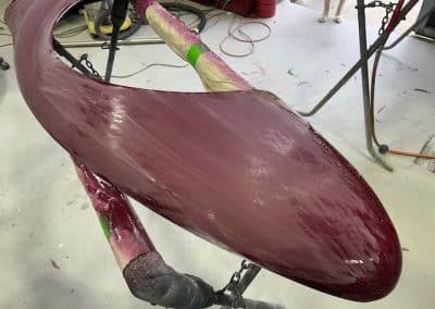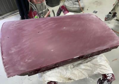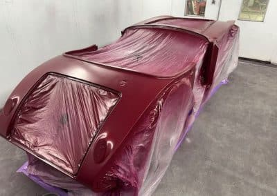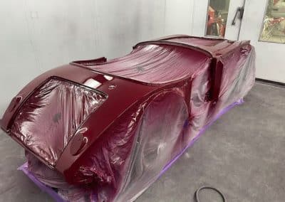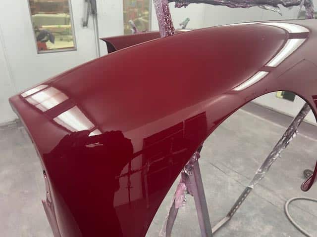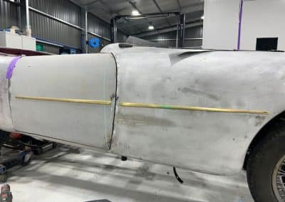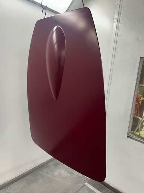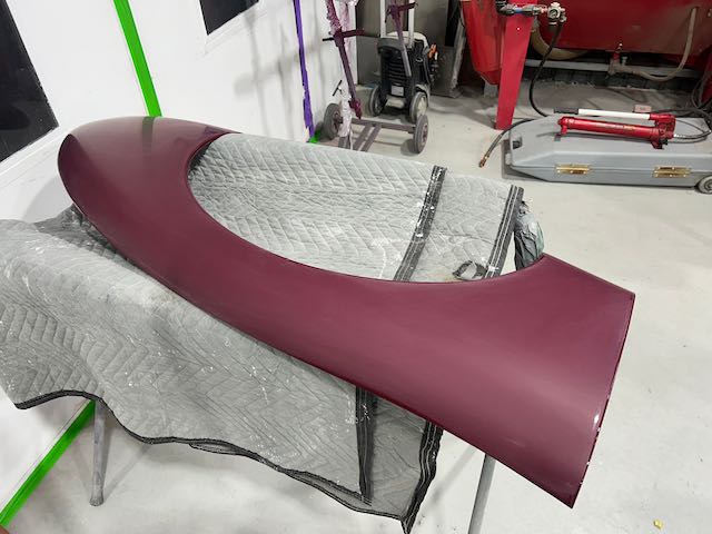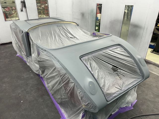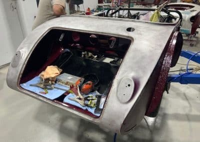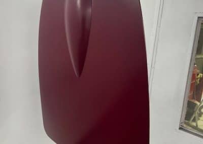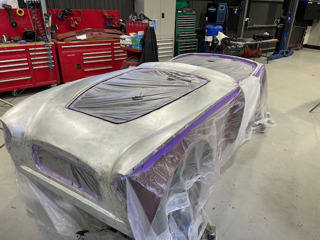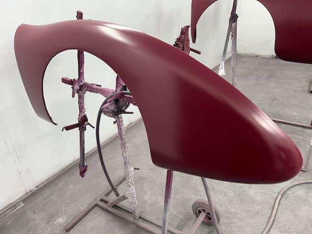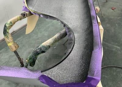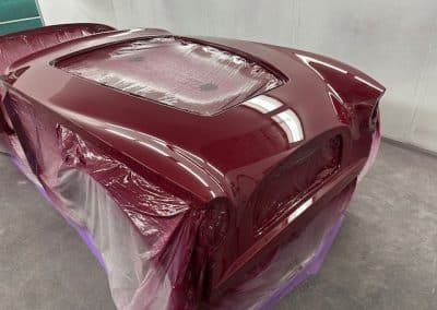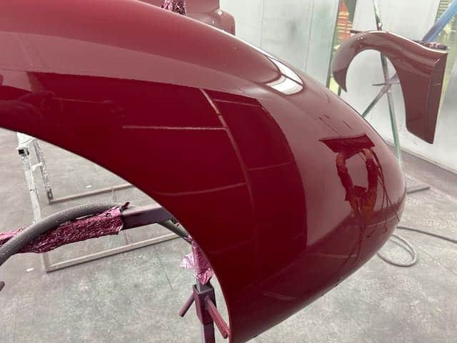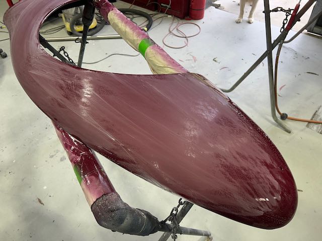 The rear shroud has been prepped and painted in colour on the underside. Then the remade front body structure was media blasted, primed, bodyworked, seam sealed, stoneguarded and painted in colour.