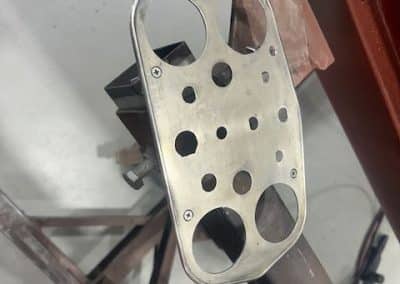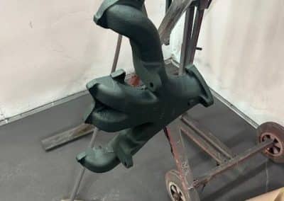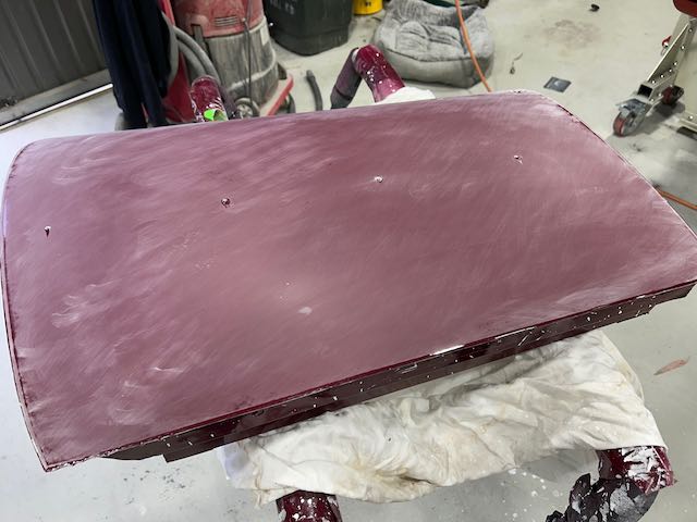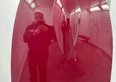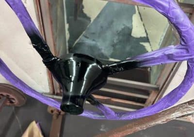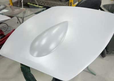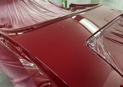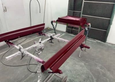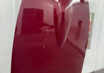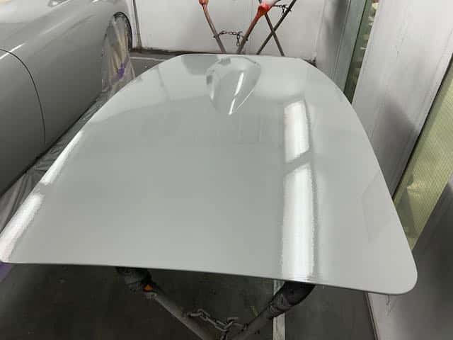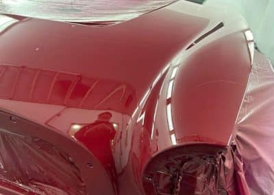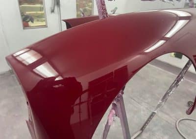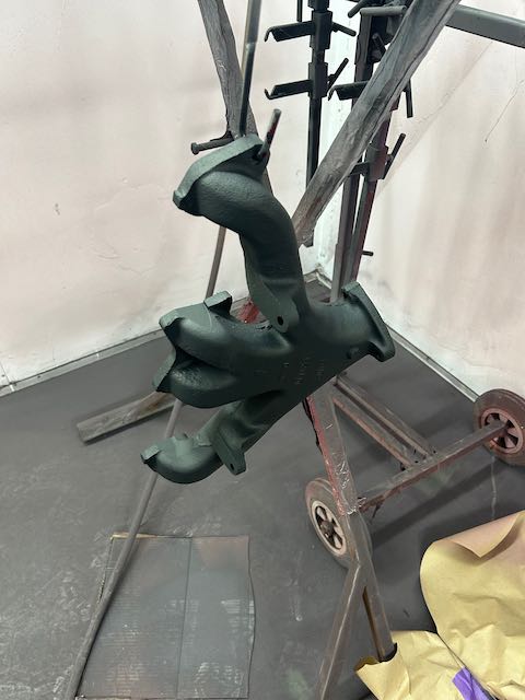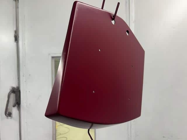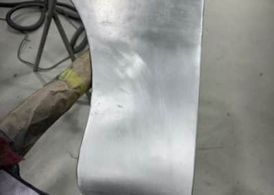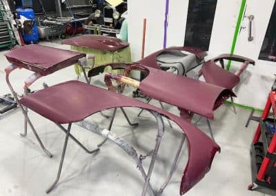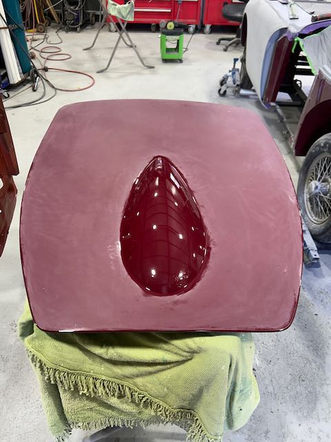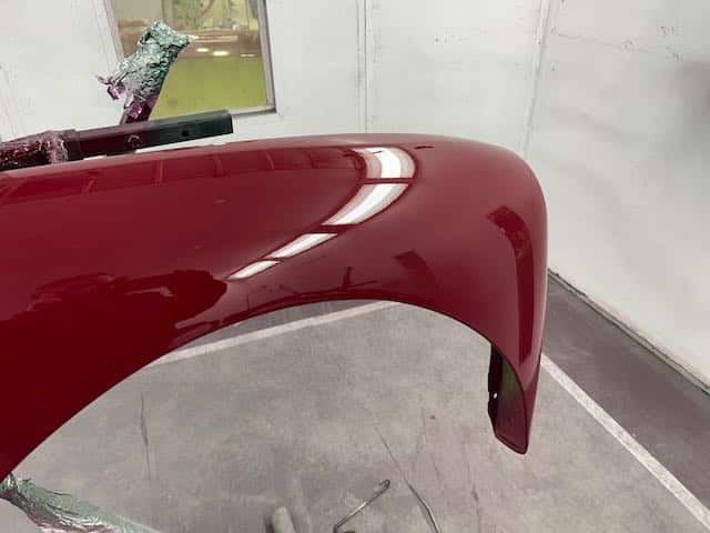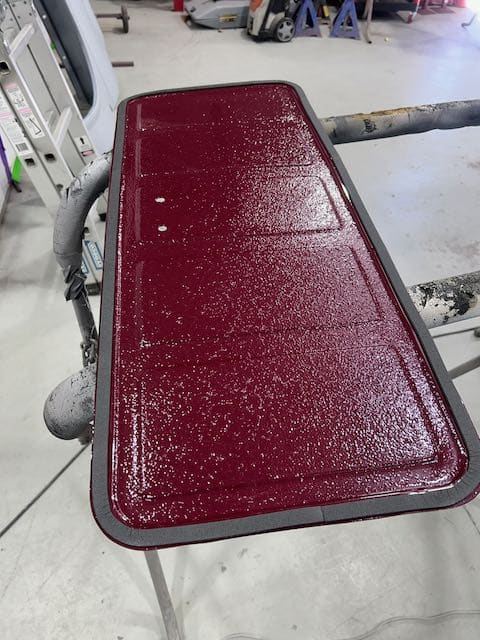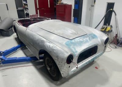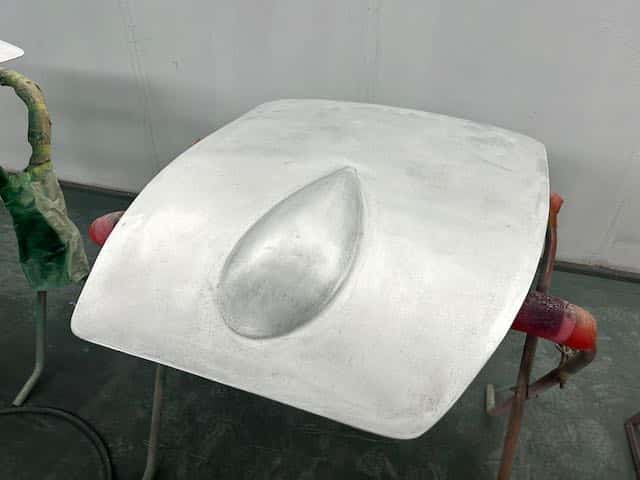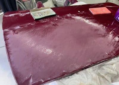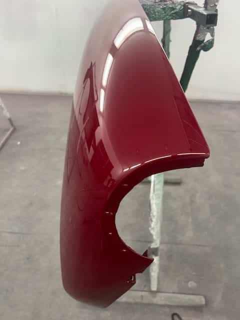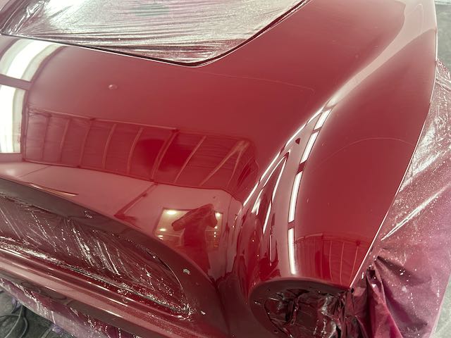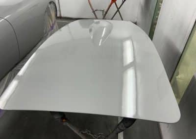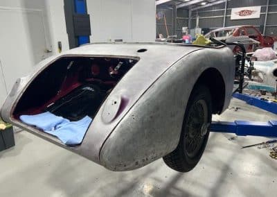 The rear shroud has been prepped and painted in colour on the underside. Then the remade front body structure was media blasted, primed, bodyworked, seam sealed, stoneguarded and painted in colour.