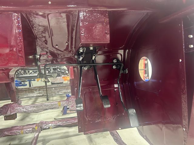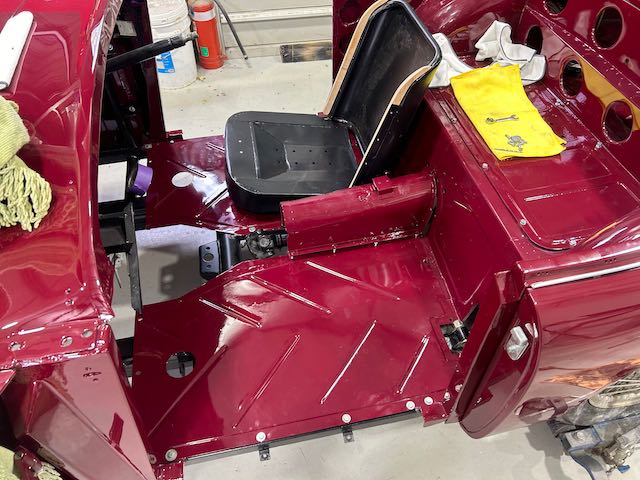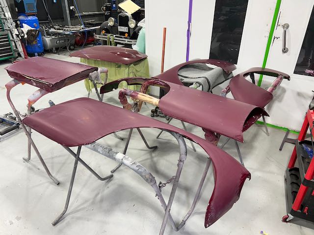 Work continues with cleaning, painting and fitting parts, the fully reconditioned radiator with new, handmade, brass top tank painted, assembly on front body structure with new brake and clutch lines and reconditioned parts being fitted.