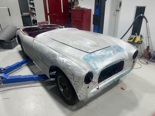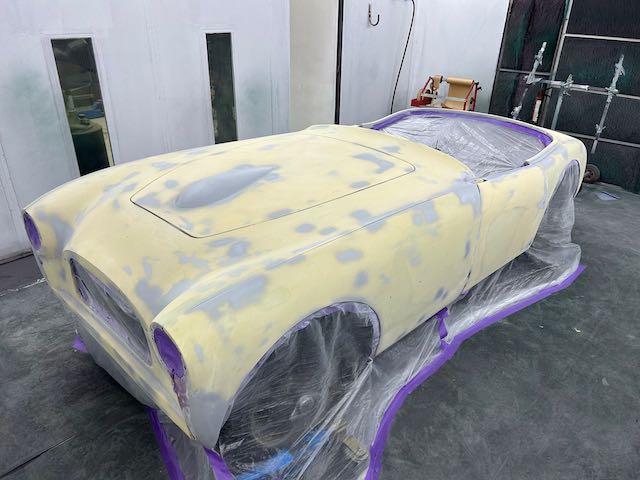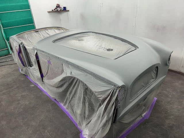 Outer panels were prepped, seam sealed, stoneguarded and painted in colour before being refitted. Then it was a whole lot of sanding filler and then priming the car.